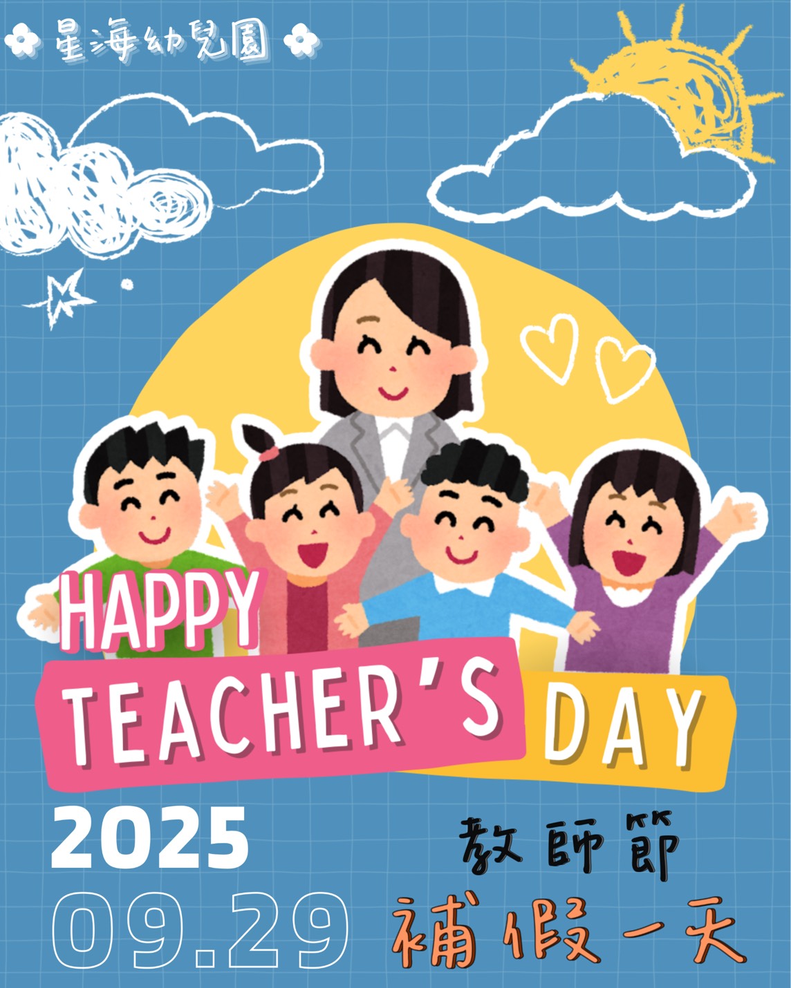 教師節連假通知:9/27(六)~9/29(一)連假3天。